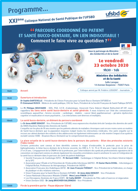 Septembre 2024 Le 25e Colloque de Santé Publique de l’UFSBD : Un engagement collectif renouvelé pour une Génération sans Carie L’Union Française pour la Santé Bucco-Dentaire (UFSBD) en collaboration avec l’Assurance Maladie, a l’honneur d’annoncer la tenue de son 25e colloque annuel sur la santé publique. Cette année, nous mettons à l’honneur le thème ambitieux : « Génération sans carie : tous acteurs dans nos cabinets dentaires ! »