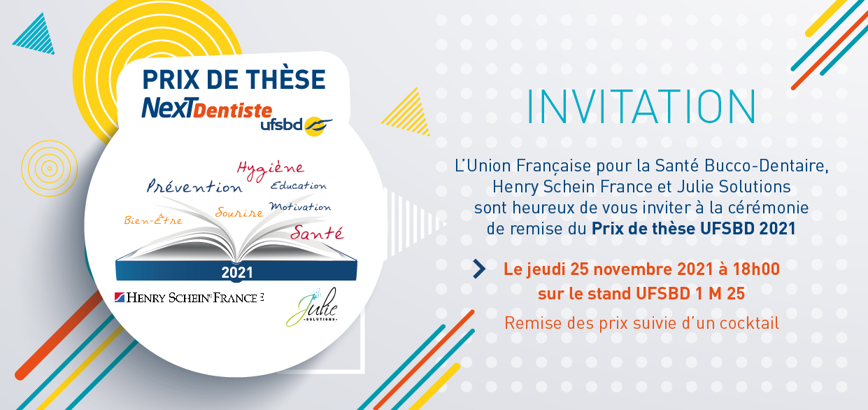 Décembre 2022 REMISE DU PRIX DE THÈSE 2022 UFSBD NexTDentiste avec le soutien d’Henry Schein, Julie Solutions et Frenchtooth Pour sa 9ème édition, l’UFSBD a eu le plaisir de remettre les 3 Prix de Thèse durant une soirée qui a réuni toute la profession lors du congrès annuel dentaire à Paris le 23 novembre 2022 : – 1er Prix au Dr Pauline CARREL, thèse « Impacts de la taxe sur les boissons sucrées au sein des politiques de santé contre les maladies non transmissibles imputables à leur consommation et rôle du chirurgien-dentiste dans cette lutte » |