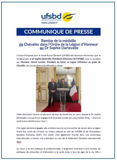 Décembre 2025 L’UFSBD est heureuse d’annoncer que, le 10 décembre, le Dr Sophie Dartevelle, Présidente d’Honneur de l’UFSBD, s’est vu remettre par Monsieur Gérard Larcher, Président du Sénat, la Légion d’Honneur au grade de Chevalier, lors d’une cérémonie officielle au Sénat. .Le communiqués de Presse ici
