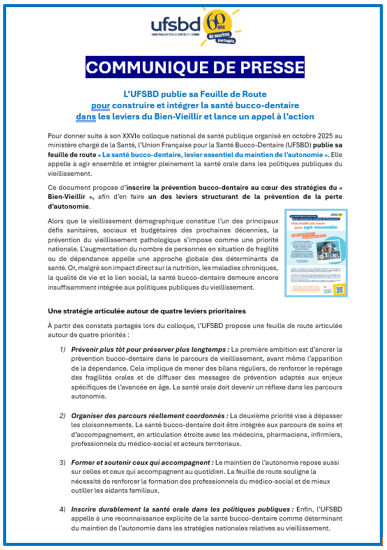 Mars 2026 L’UFSBD publie sa Feuille de Route pour construire et intégrer la santé bucco-dentaire dans les leviers du Bien-Vieillir et lance un appel à l’action Pour donner suite à son XXVIe colloque national de santé publique organisé en octobre 2025 au ministère chargé de la Santé, l’Union Française pour la Santé Bucco-Dentaire (UFSBD) publie sa feuille de route « La santé bucco-dentaire, levier essentiel du maintien de l’autonomie ». Elle appelle à agir ensemble et intégrer pleinement la santé orale dans les politiques publiques du vieillissement. .Le communiqués de Presse ici |